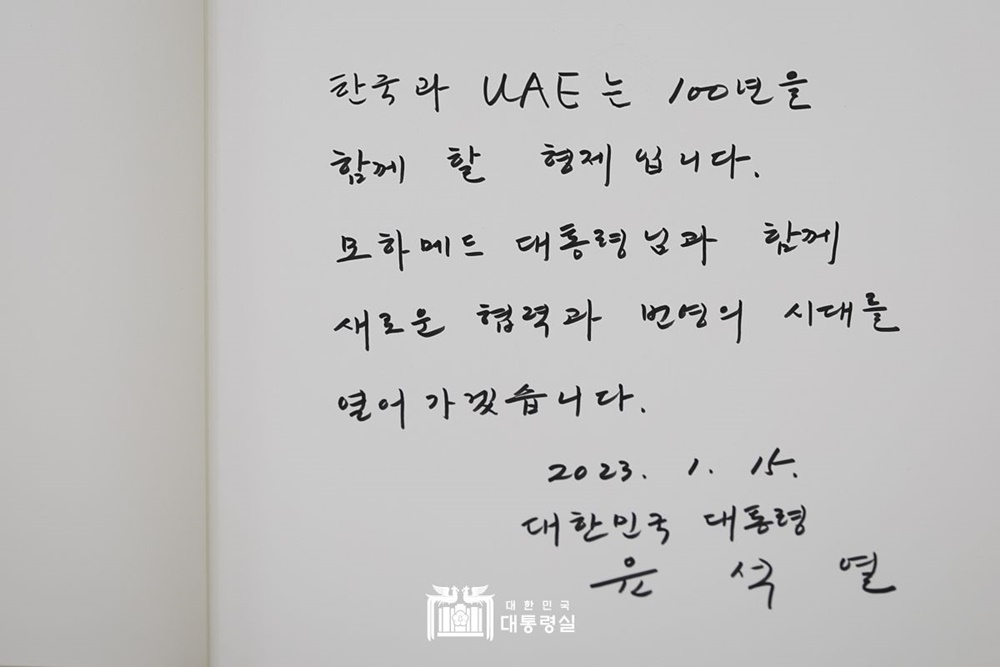 1월 15일 윤석열 대통령 부부는 공식환영식 참석 및 방명록에 서명했습니다.
